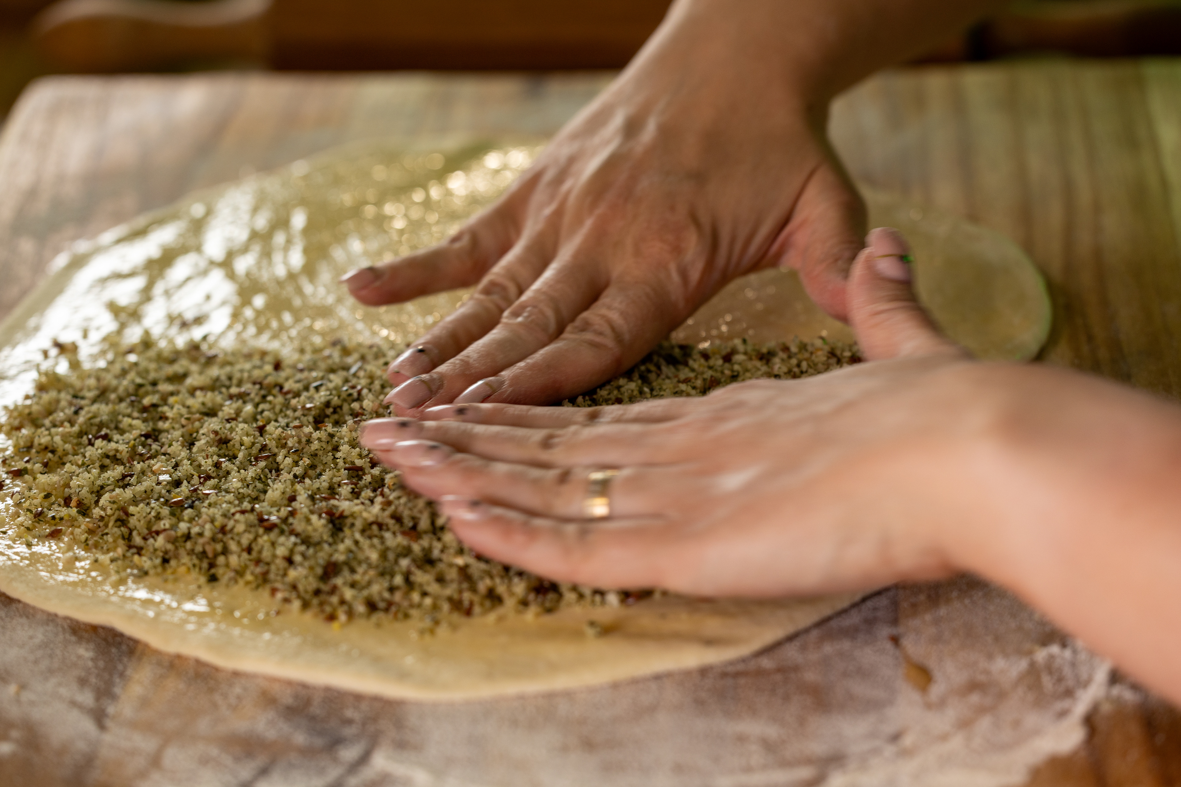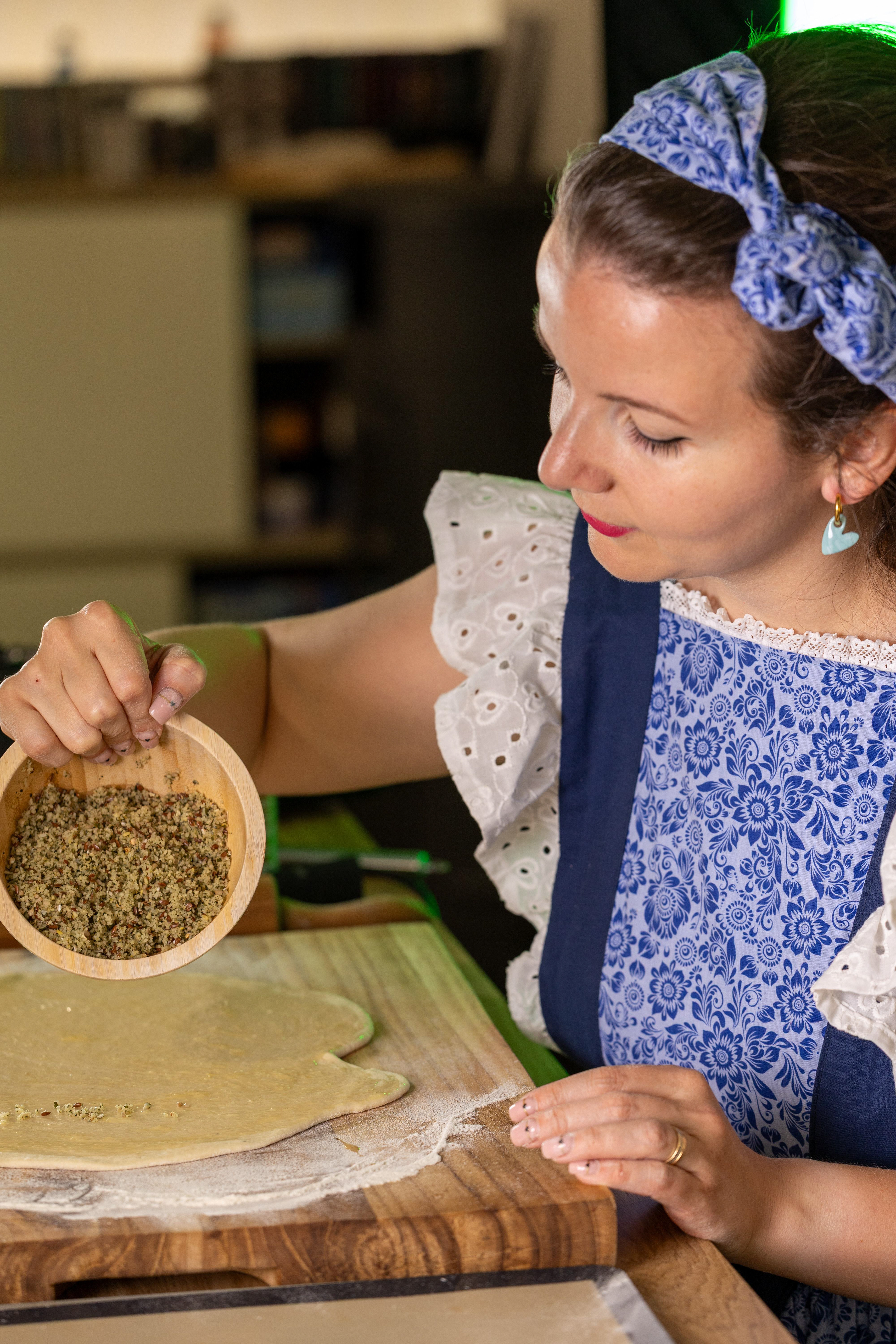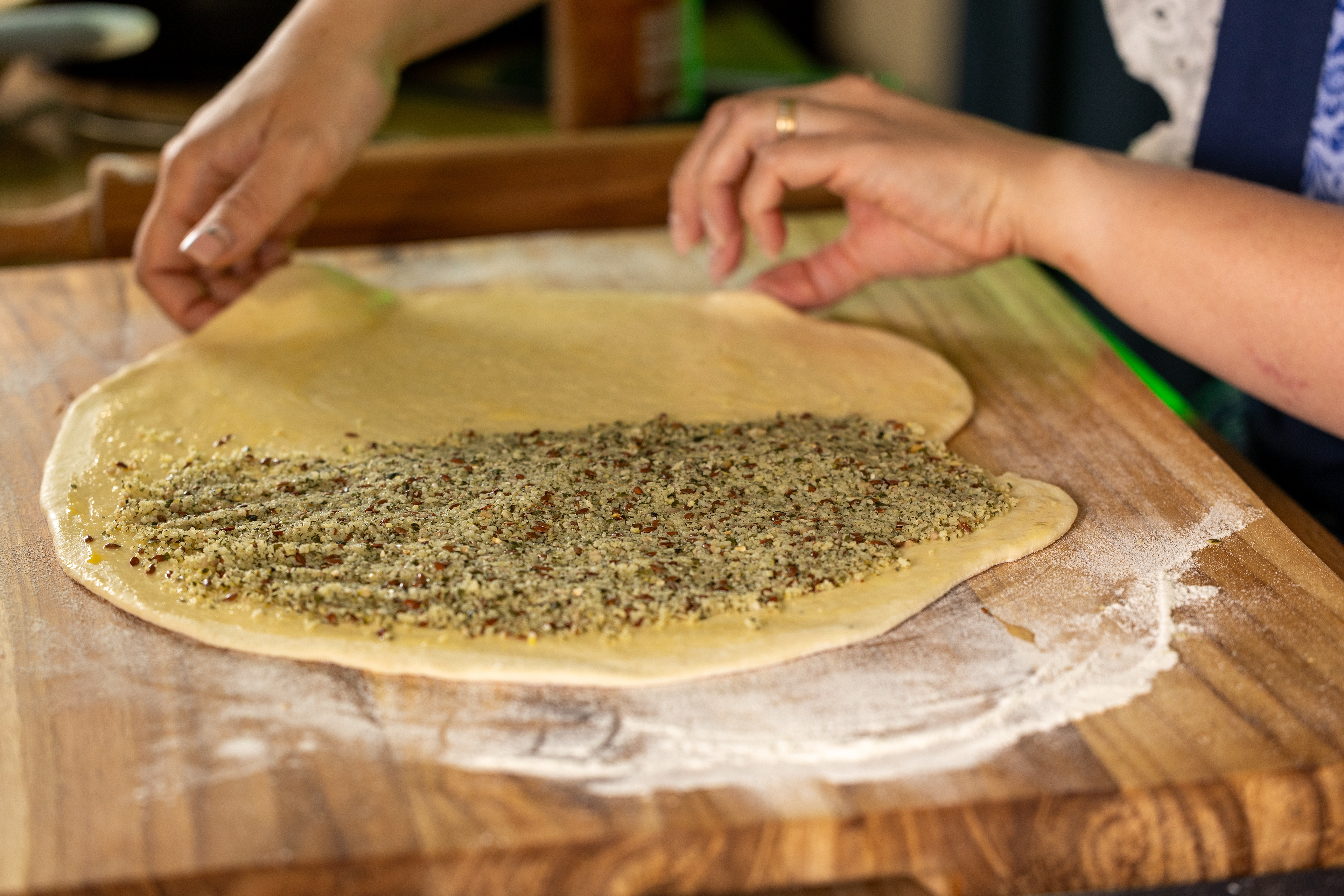 5 - Saupoudrer la moitié de la surface des 2 rectangles avec le mélange graines de potiron-fromage.