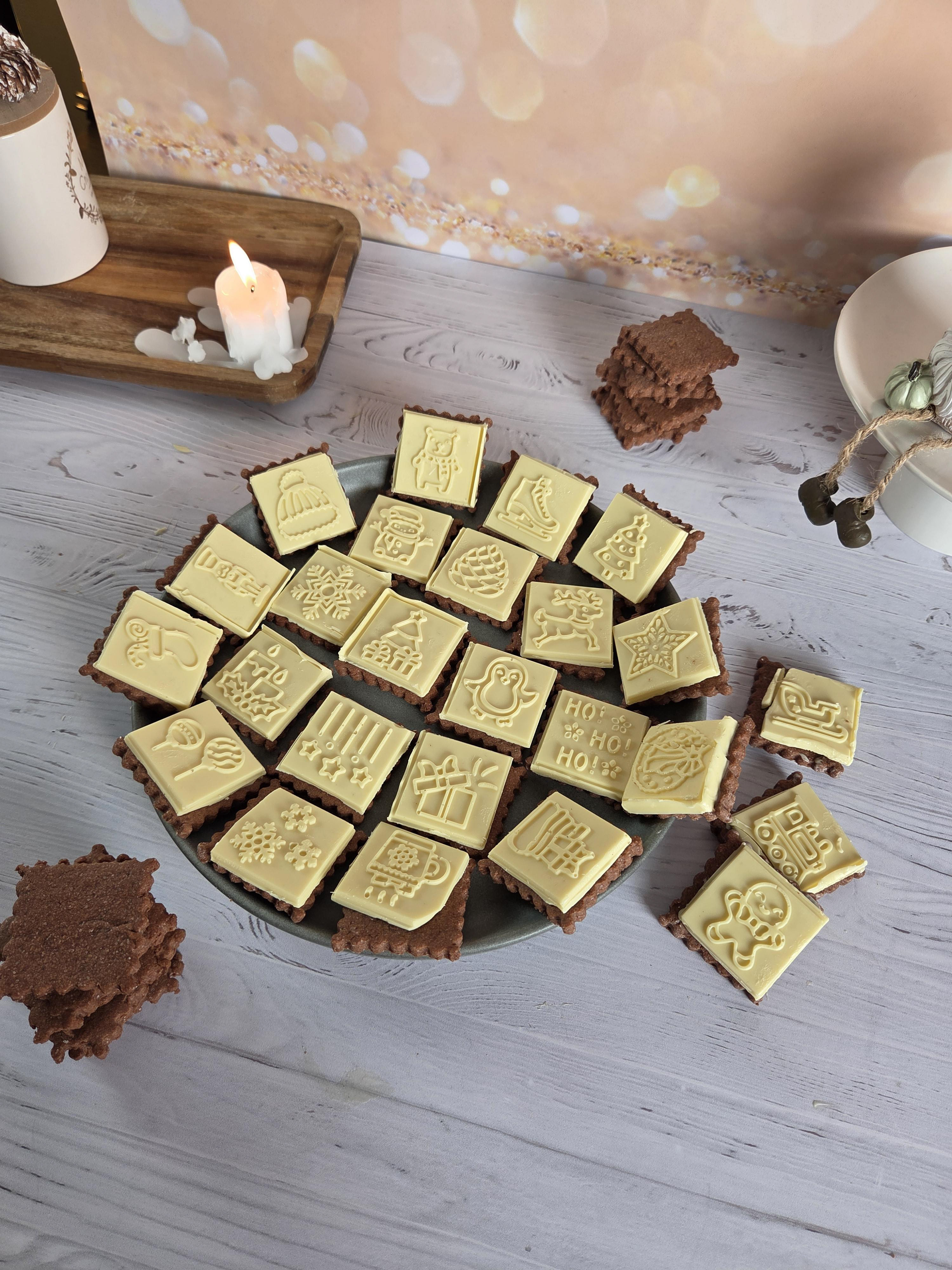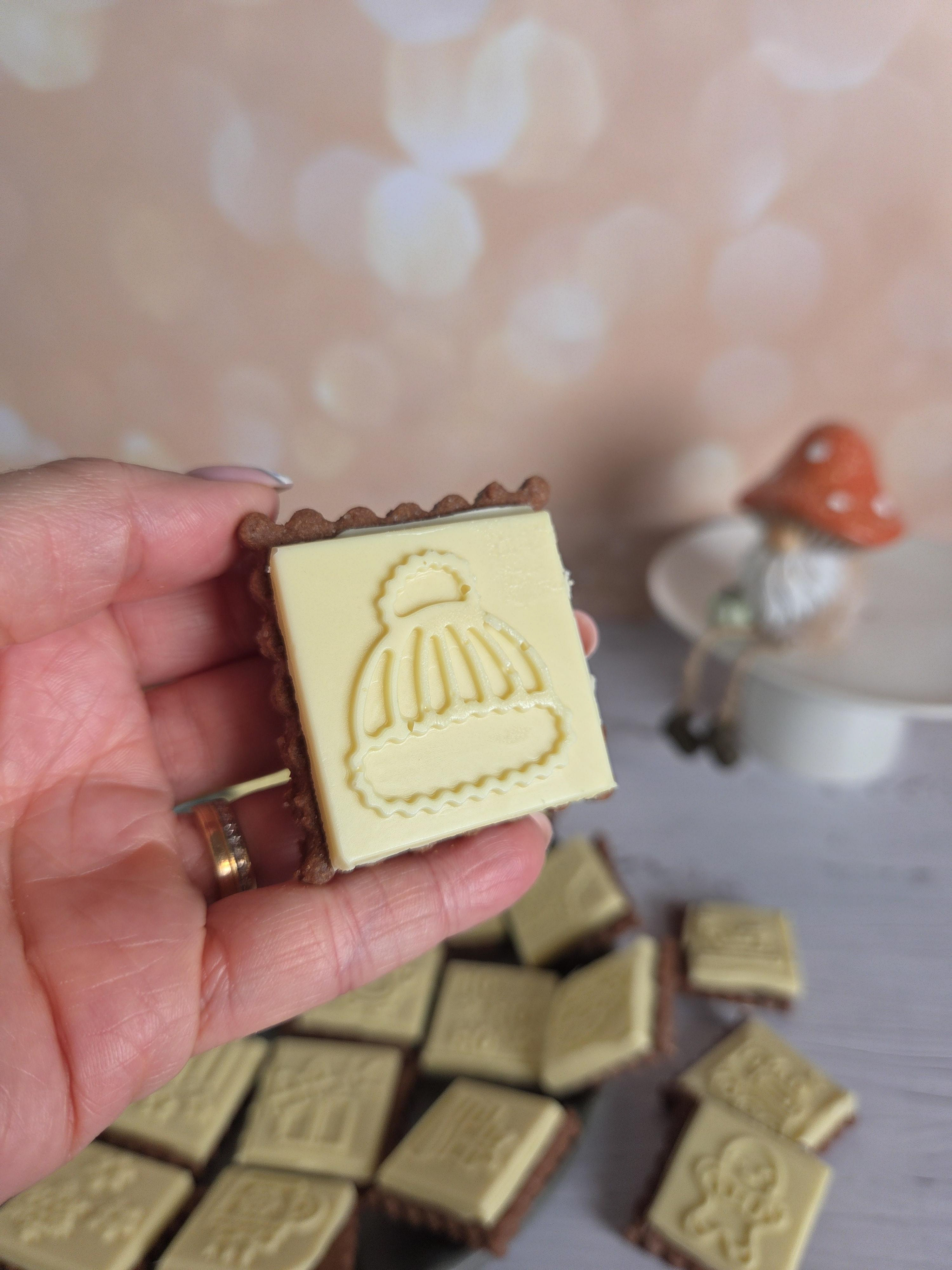 3 - Découper les carrés de chocolat et les coller aux biscuits avec un peu de chocolat blanc fondu.