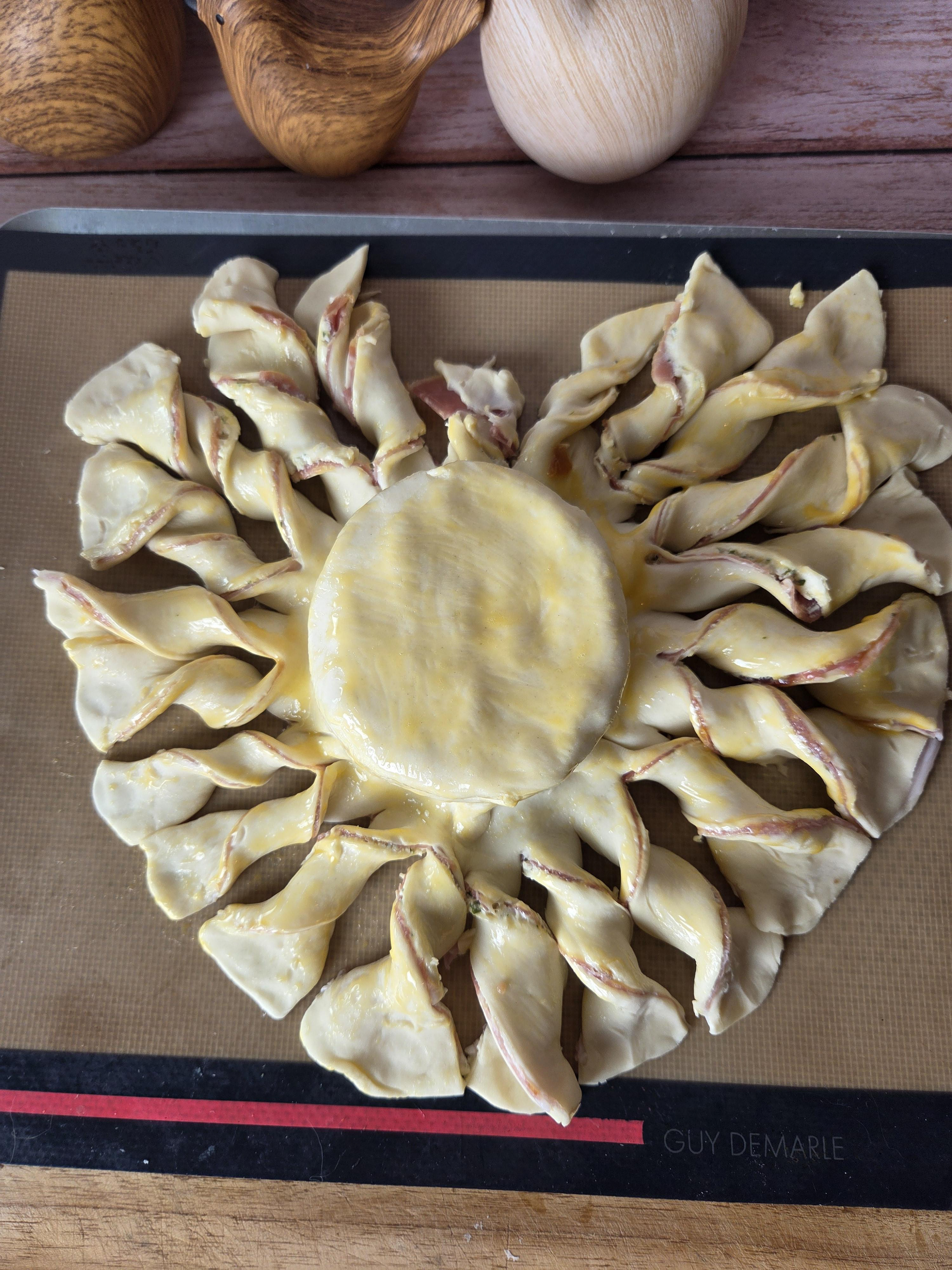 10. Badigeonner de jaune d'oeuf puis enfourner 30 minutes à 200°C, jusqu’à ce que la pâte soit bien dorée.