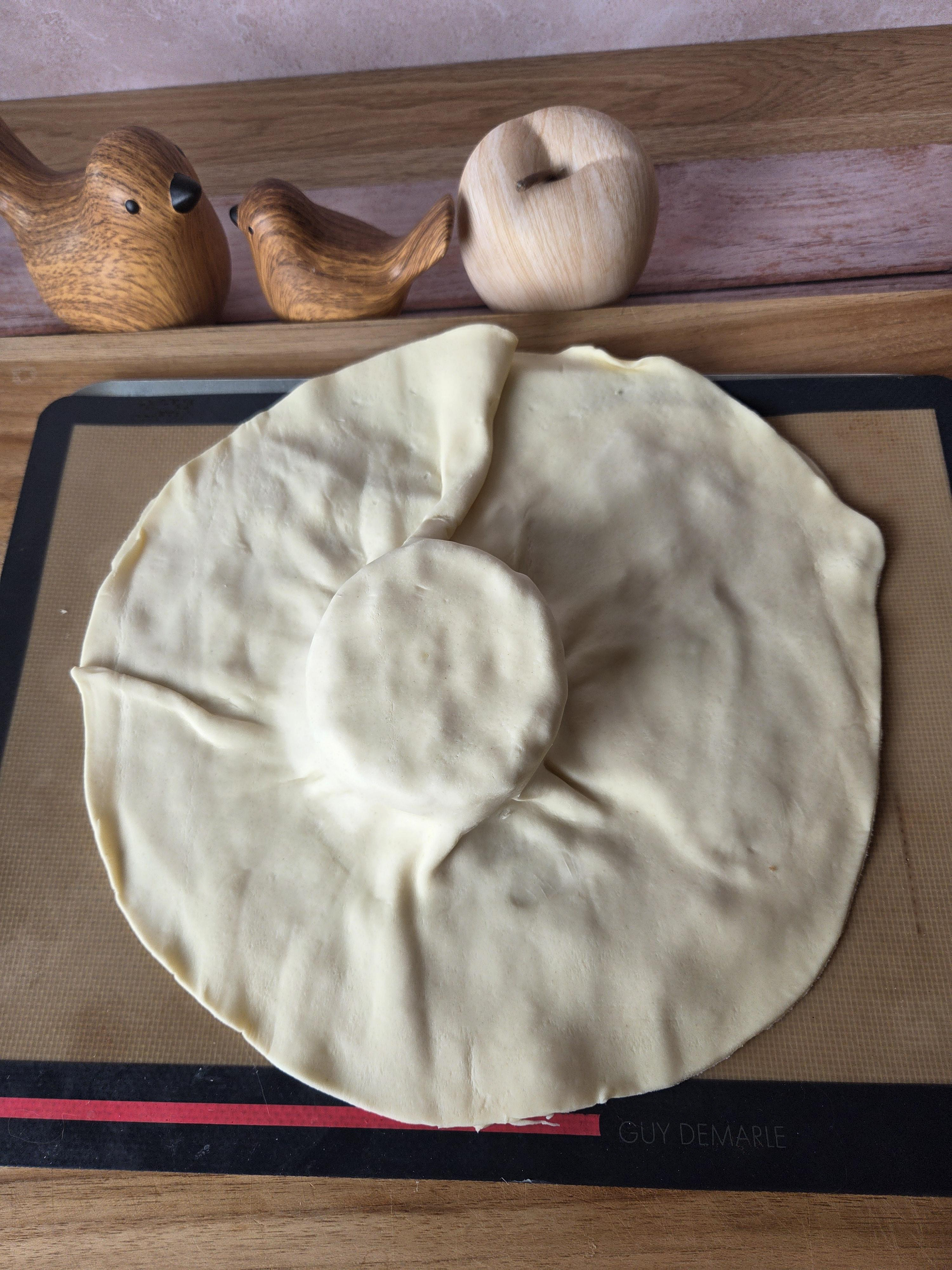 7. Recouvrir avec la deuxième pâte feuilletée. Bien serrer autour du fromage pour éviter qu’il ne s’échappe à la cuisson.