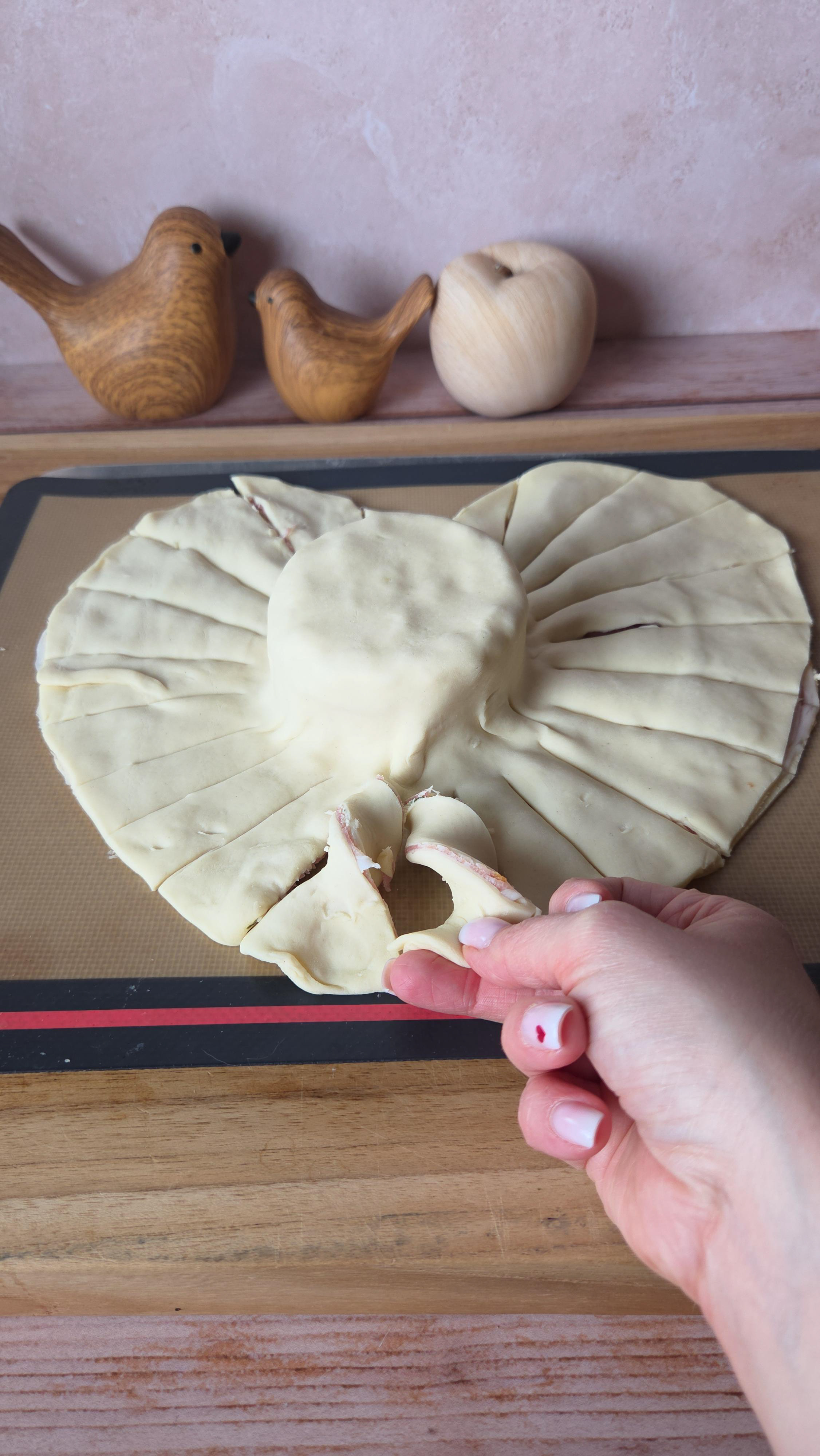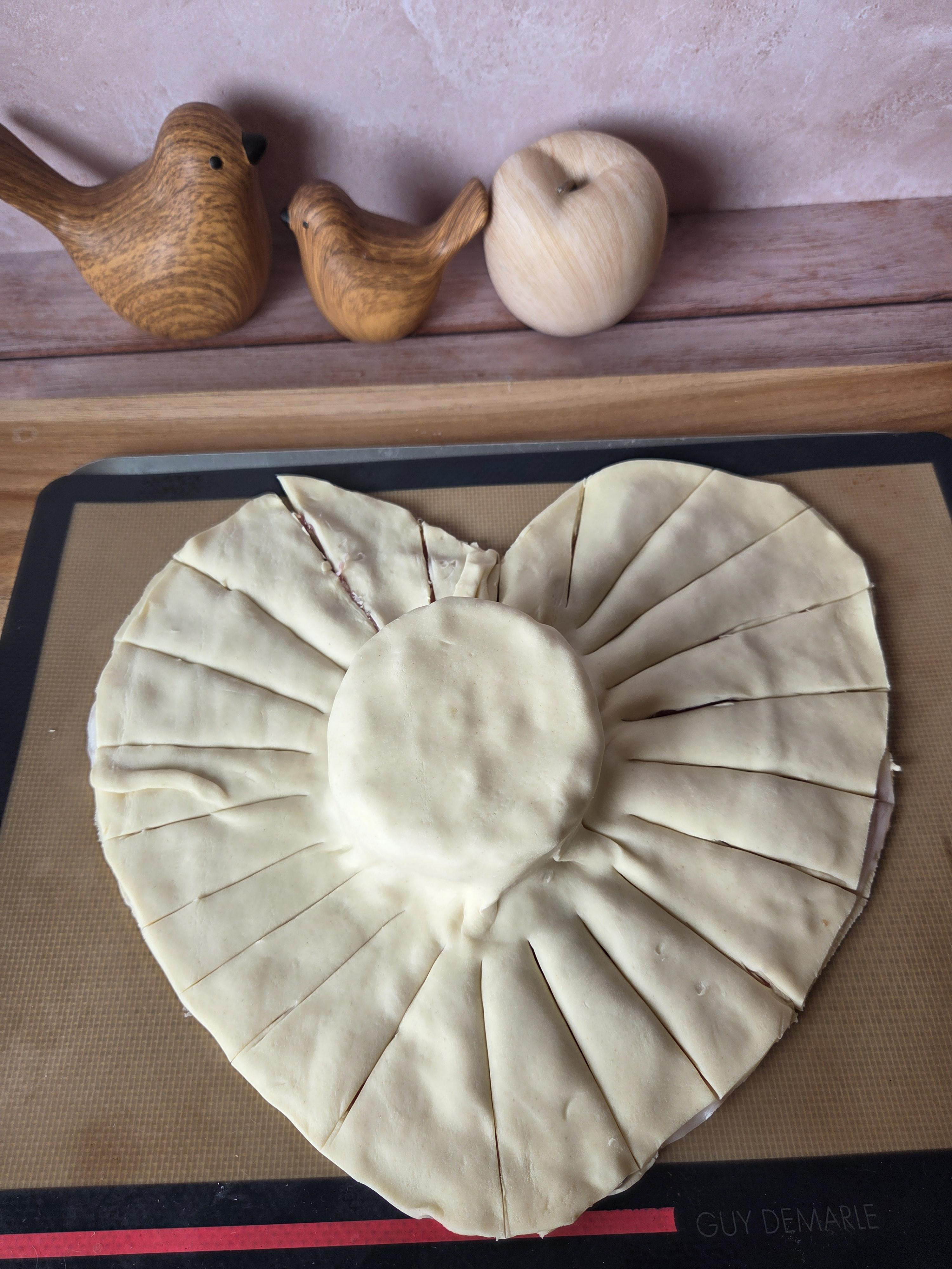 8. À l’aide du gabarit en papier, découper la pâte du dessus pour former un cœur.