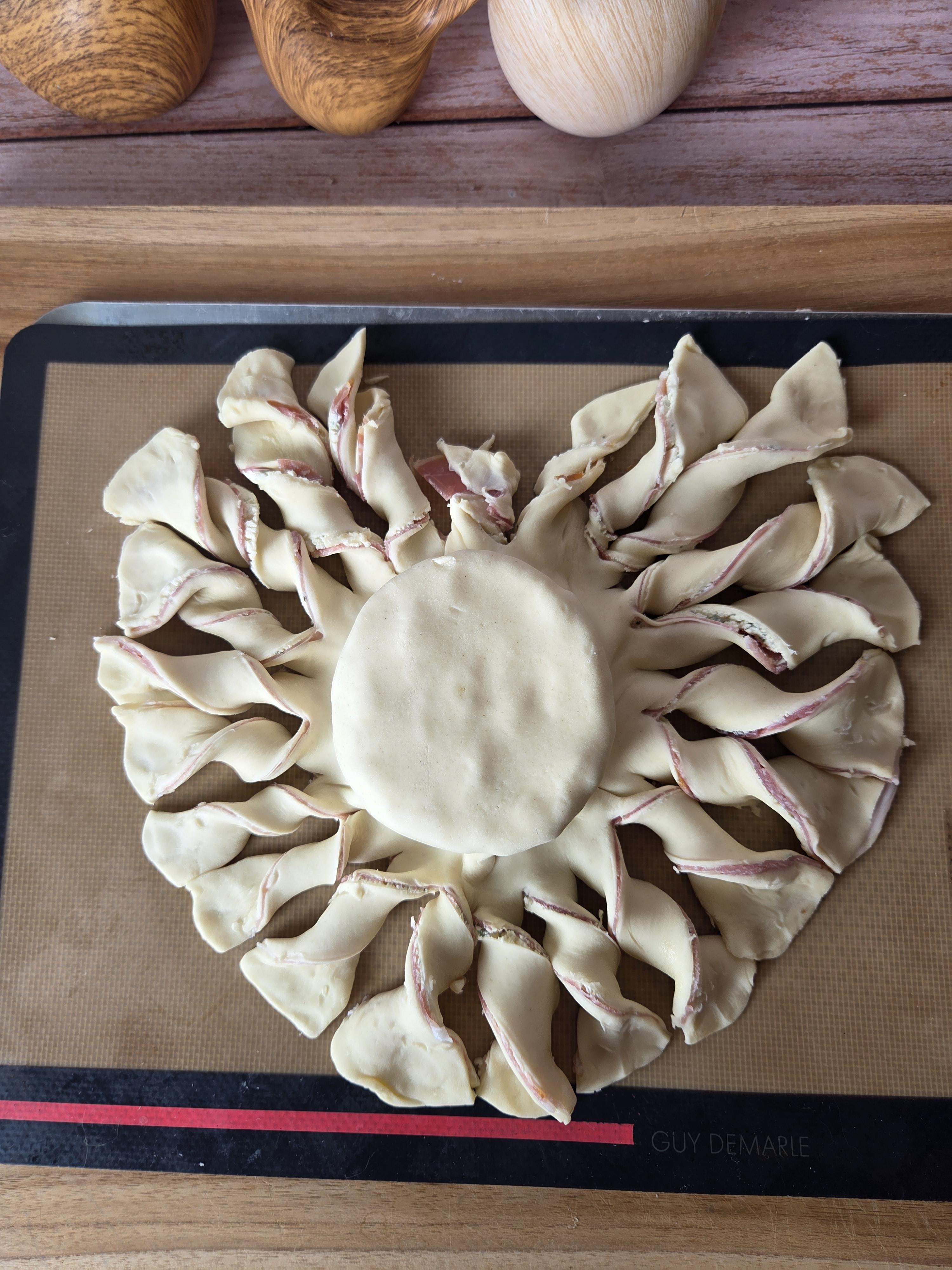 9. Tout autour du fromage, découper des bandes de pâte (environ 1 cm de large) et les torsader deux fois chacune pour créer un effet décoratif.