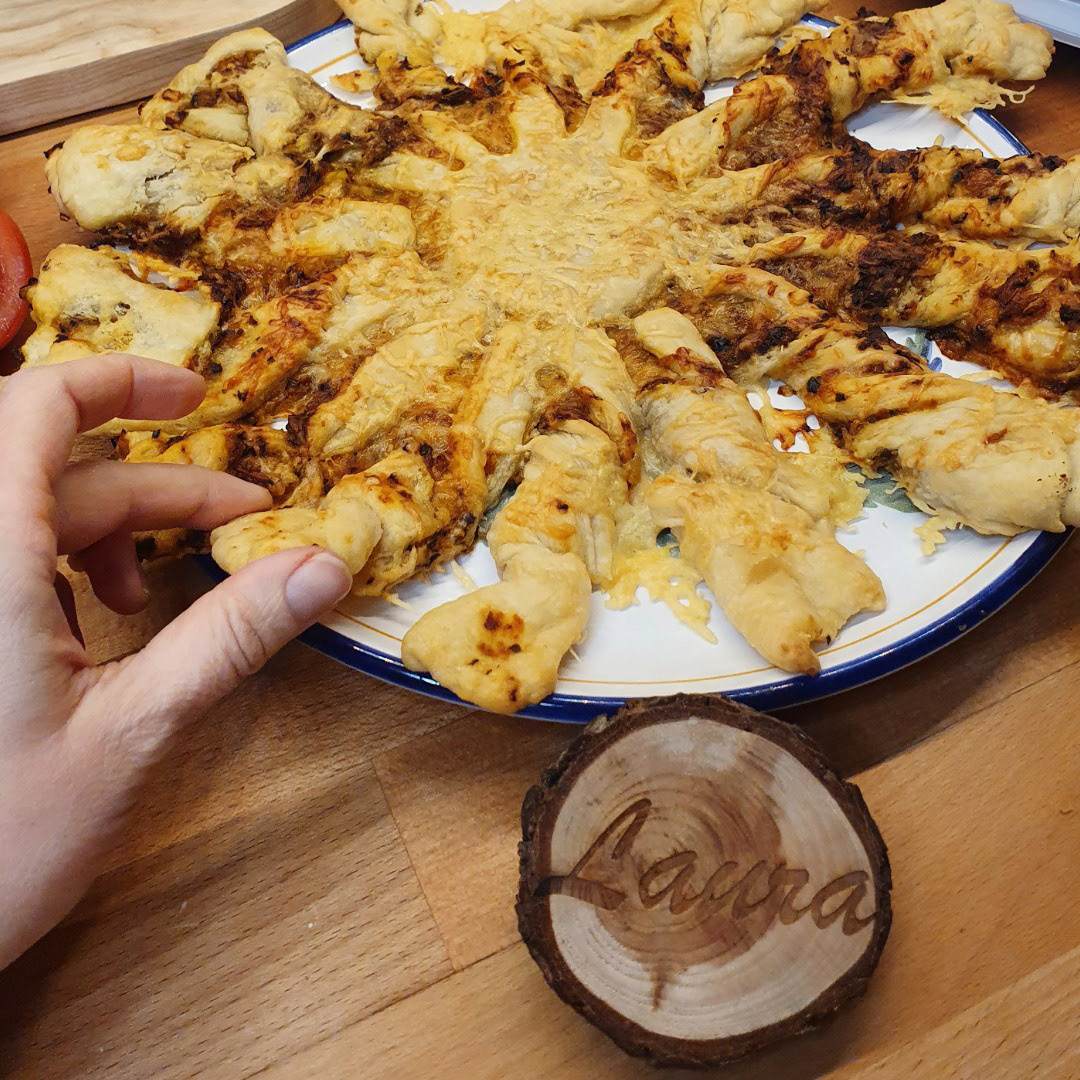 11. Recouvrir avec la deuxième pâte feuilletée. Poser un verre au centre du feuilleté, puis tracer 16 rayons avec un couteau à partir du verre. Retirer le verre, puis torsader chaque rayon.