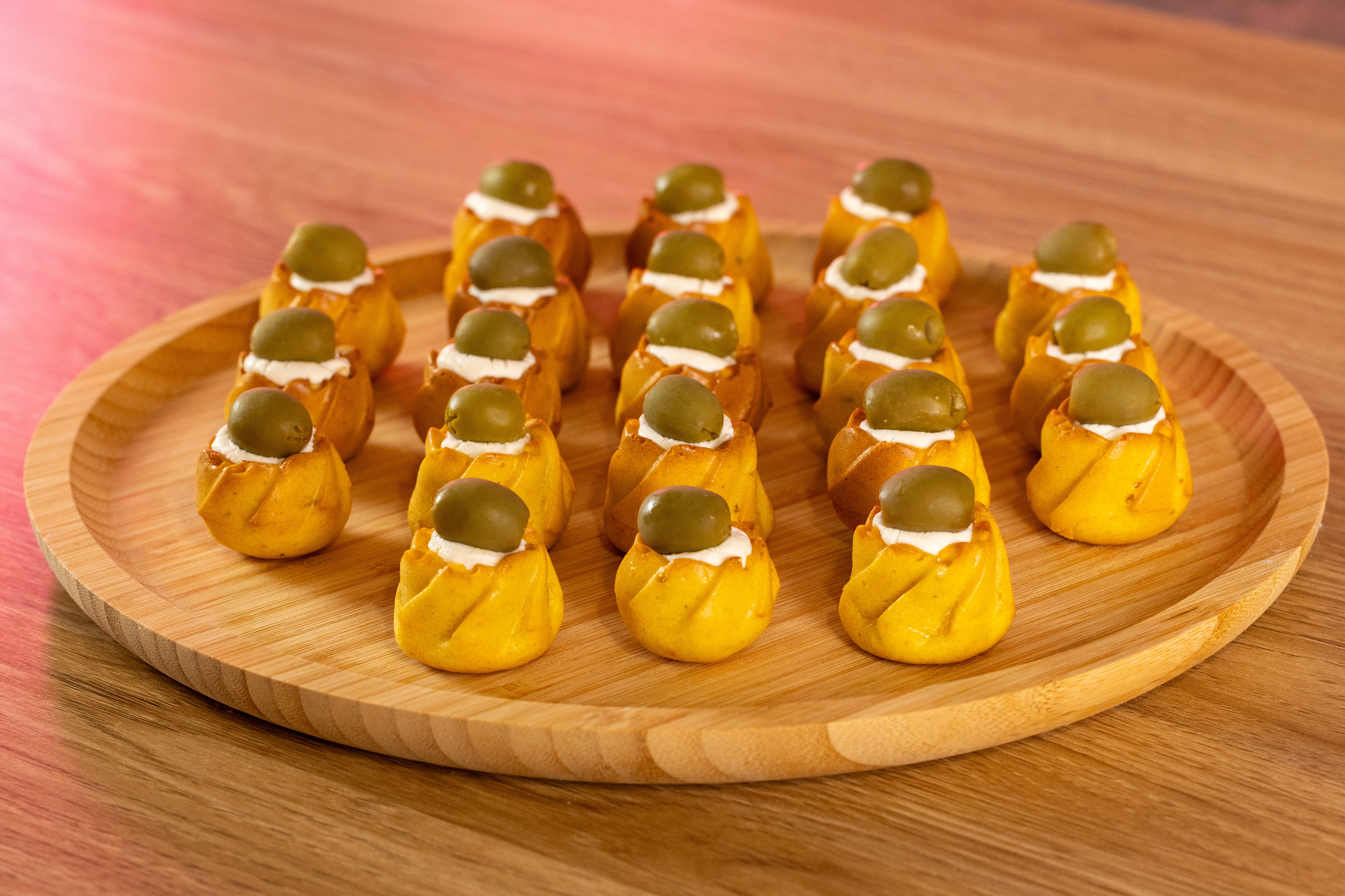 9- À l’aide d’une poche à douille, garnir le creux de chaque mini-spirale de fromage frais. Déposer une olive sur chaque mini-spirale pour la décoration.