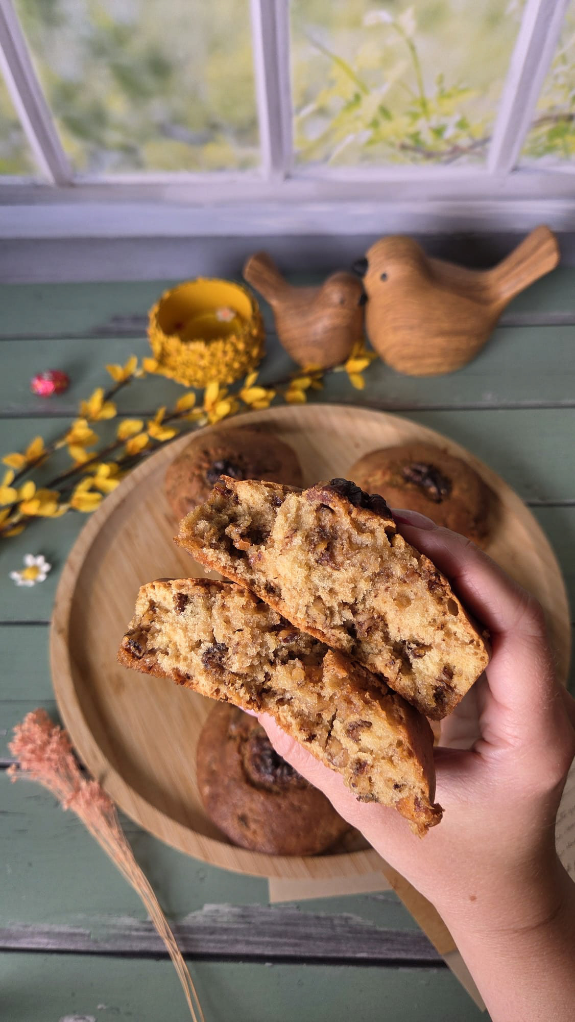 5. Incorporer 5 g de levure chimique et 180 g de farine. Mélanger jusqu’à obtenir une pâte homogène. Ajouter les noix caramélisées.