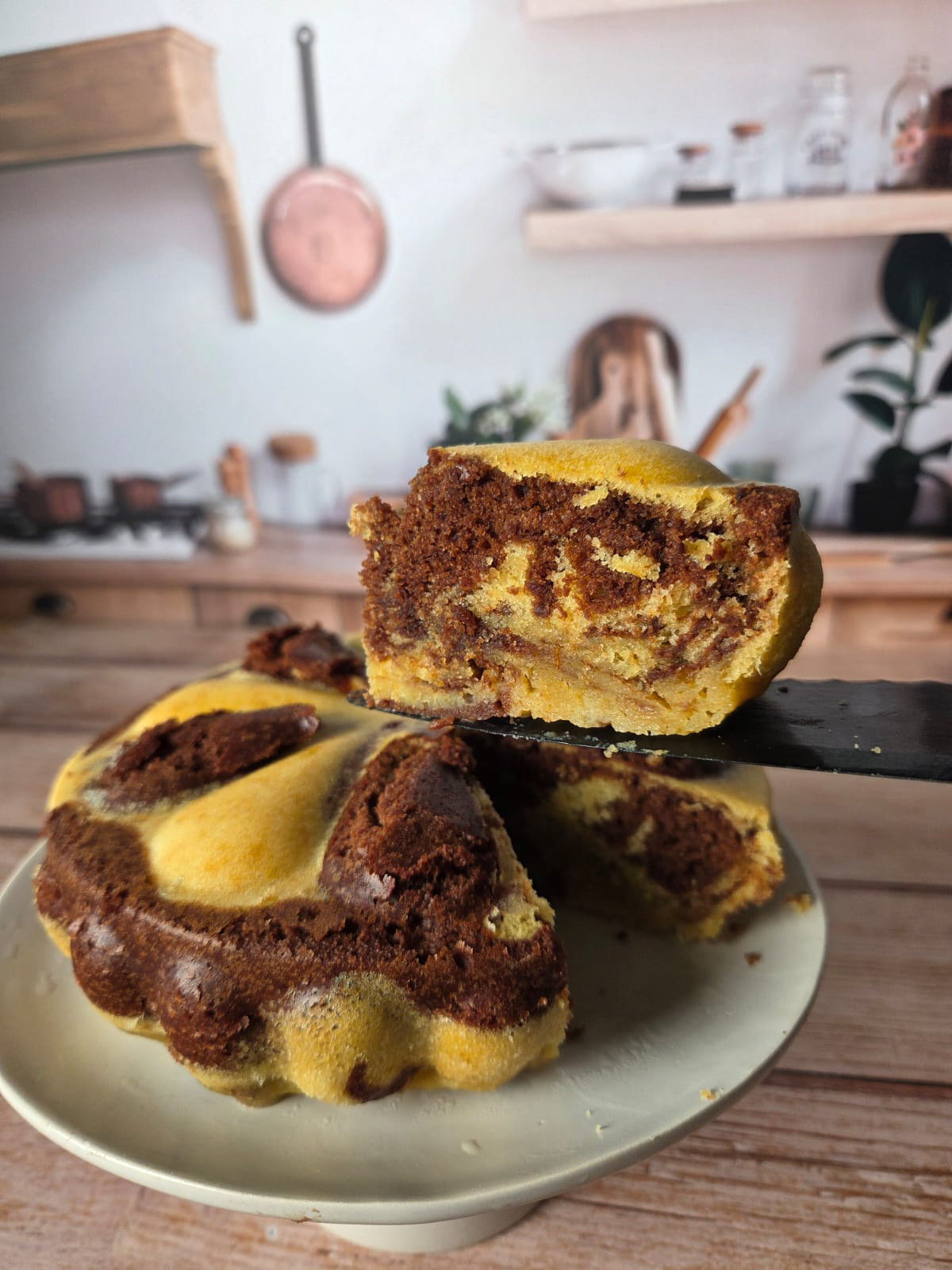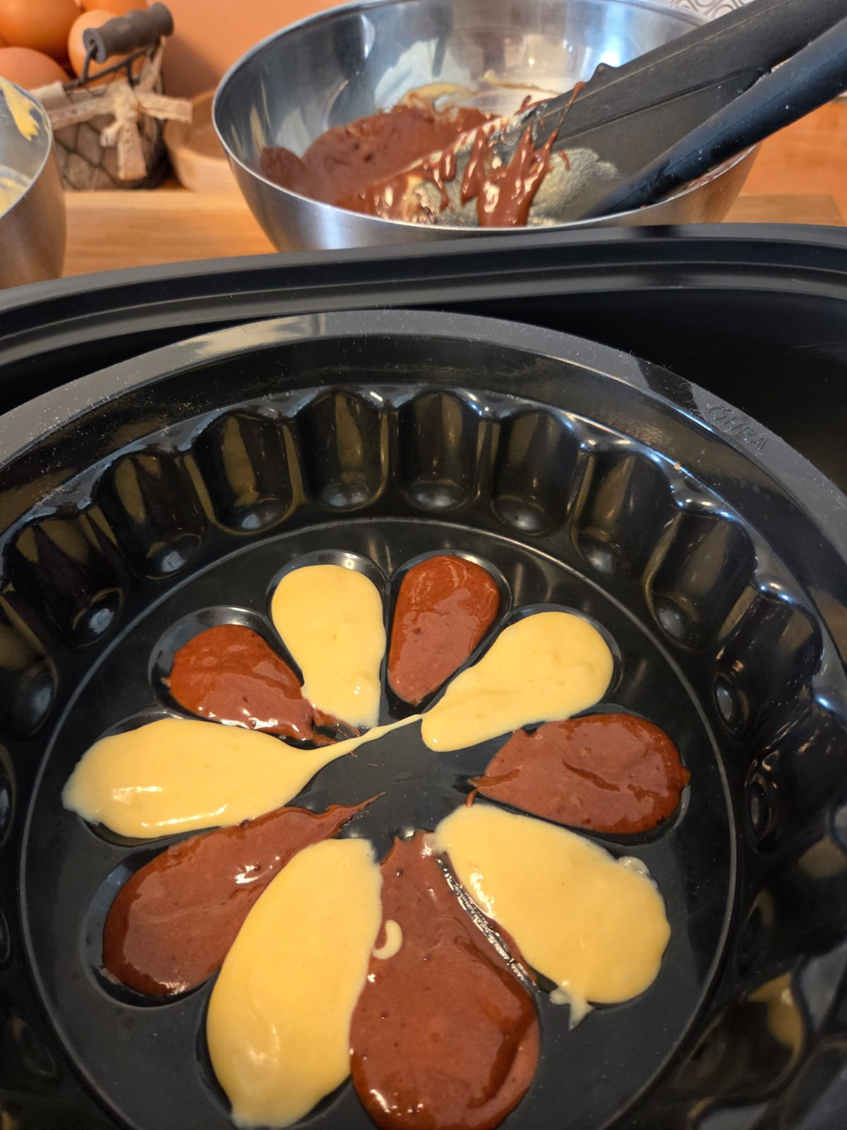 18. Verser alternativement la pâte à la vanille et la pâte au chocolat dans le moule Florea préparé, en créant des motifs pour l’effet marbré (utiliser une cuillère ou un couteau pour créer des volutes si souhaité).