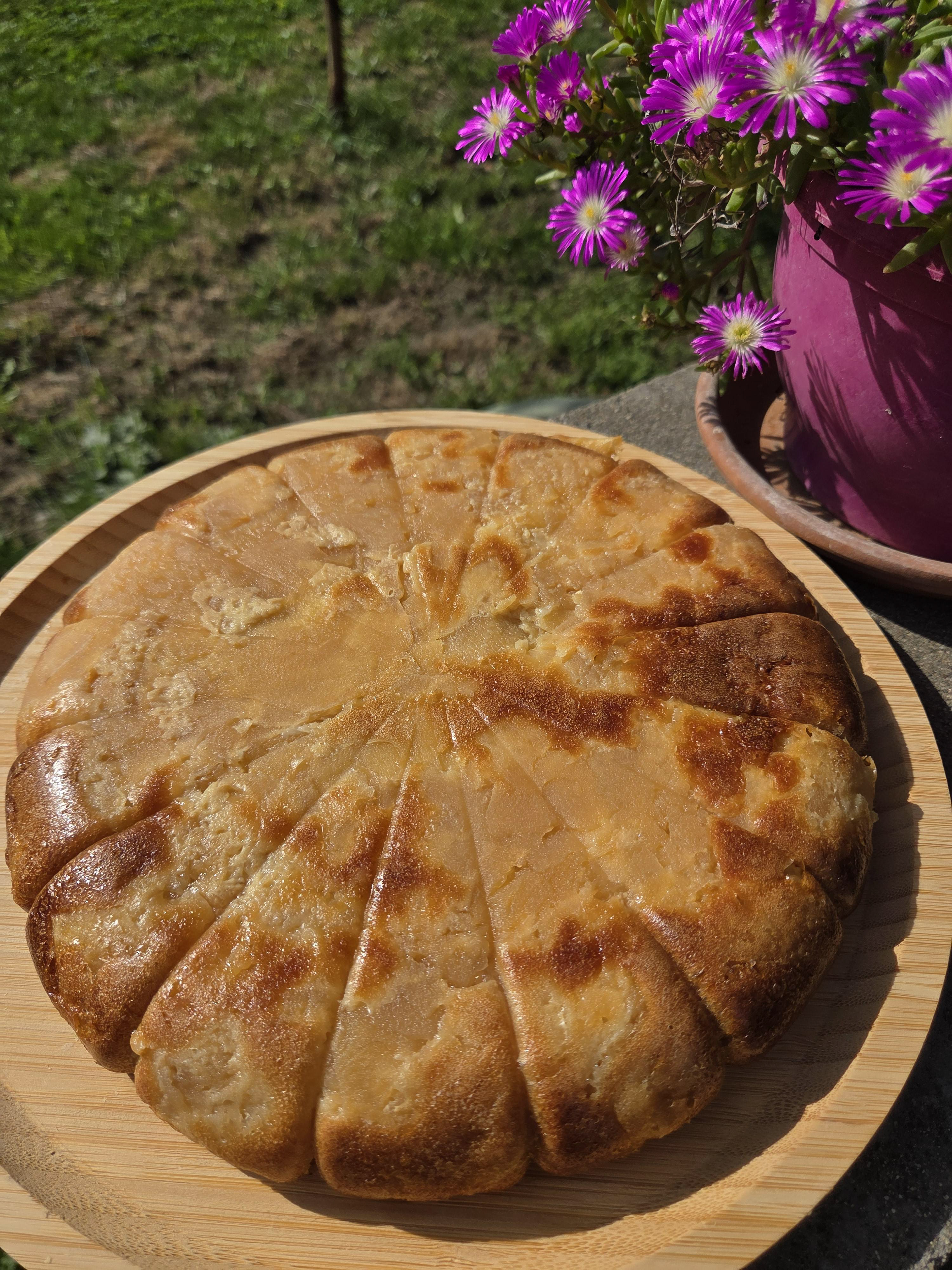 7. Verser la pâte uniformément sur les lamelles de pommes dans le moule.