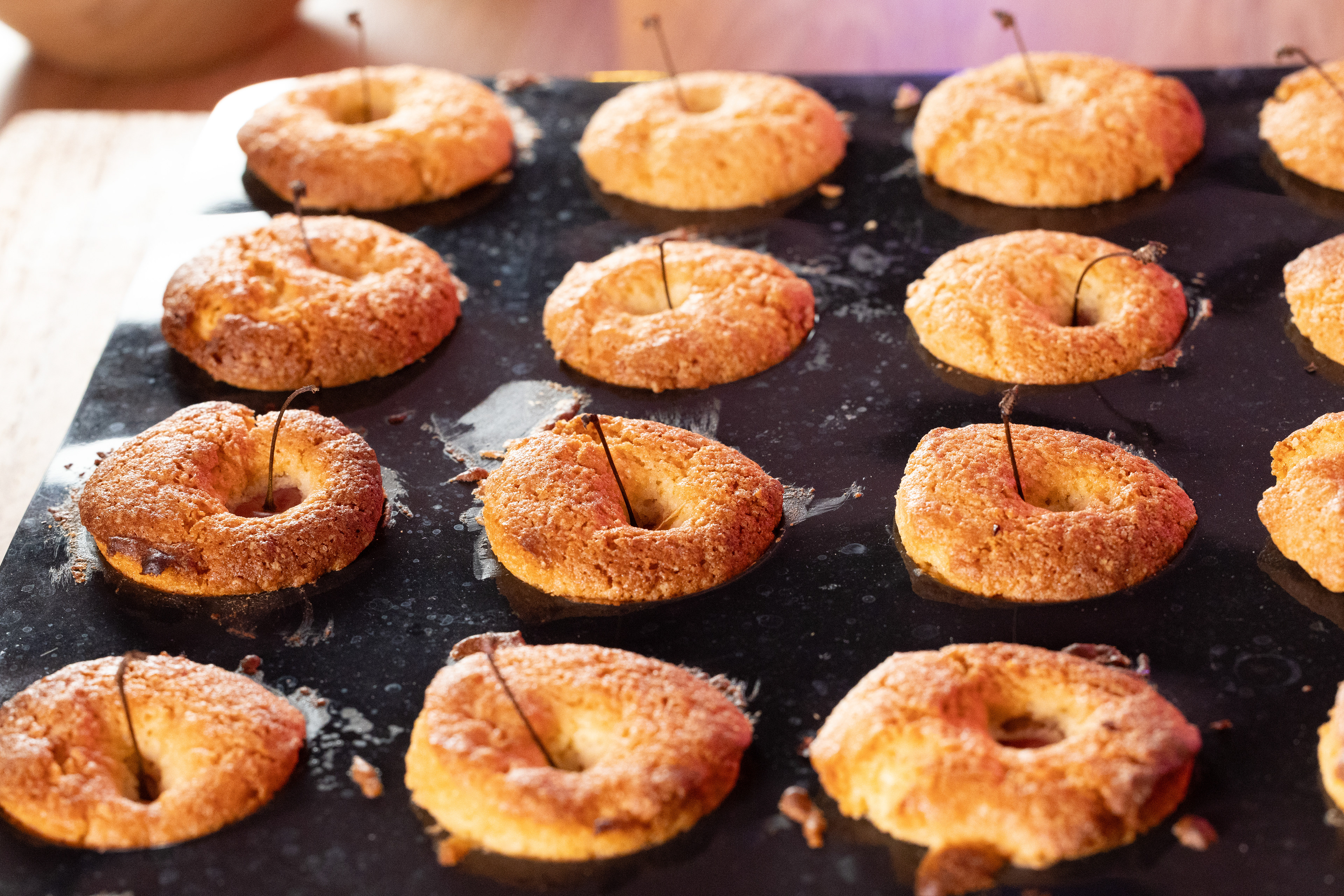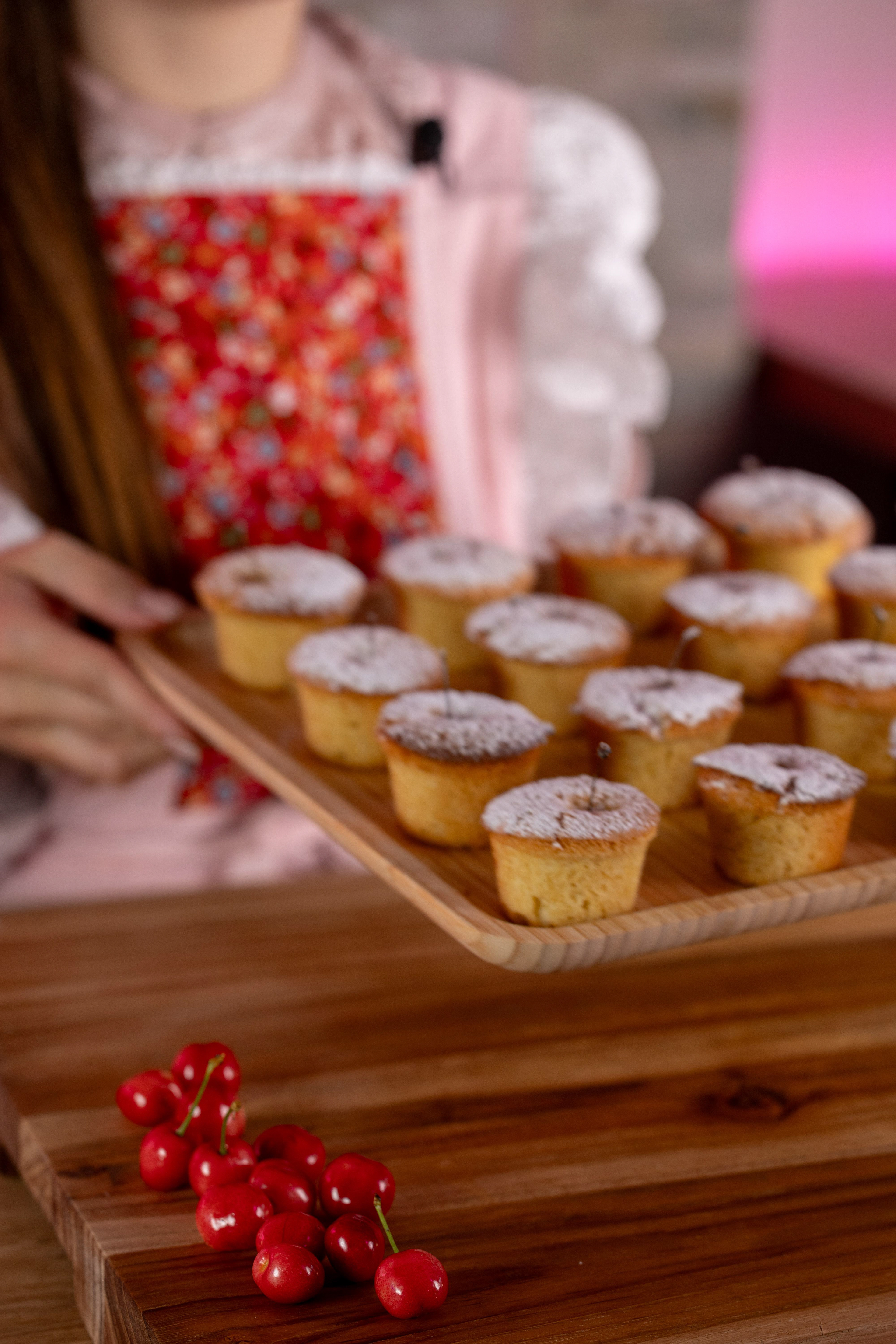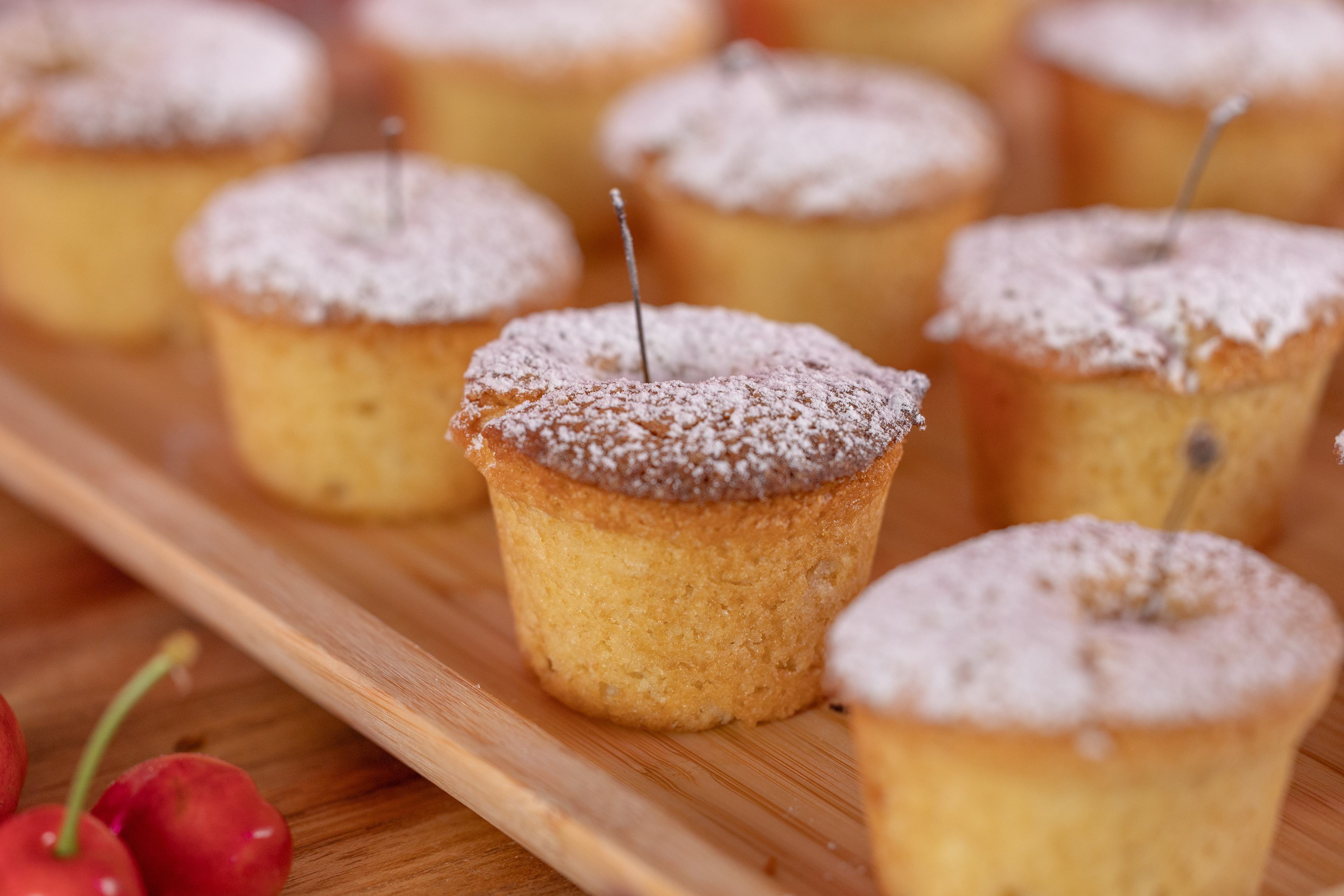 7 - Planter 1 cerise au centre de chaque empreinte en laissant la queue apparente.