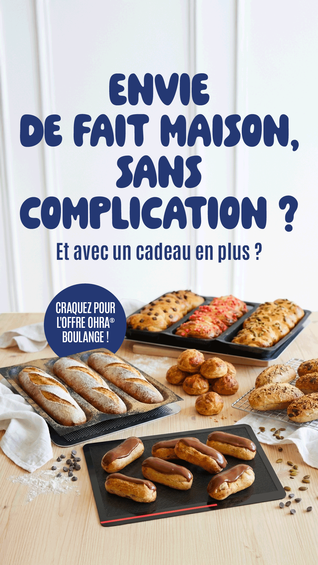 Moule 3 baguettes Ohra® (ref. BP-000001), moule 20 pains individuels Ohra® (ref. BP-000002), moule 12 pains allongés Ohra® (ref. BP-000003), moule 3 brioches Ohra® (ref. BP-000004), toile boulangère 40×30 cm Ohra® (BT-000001)