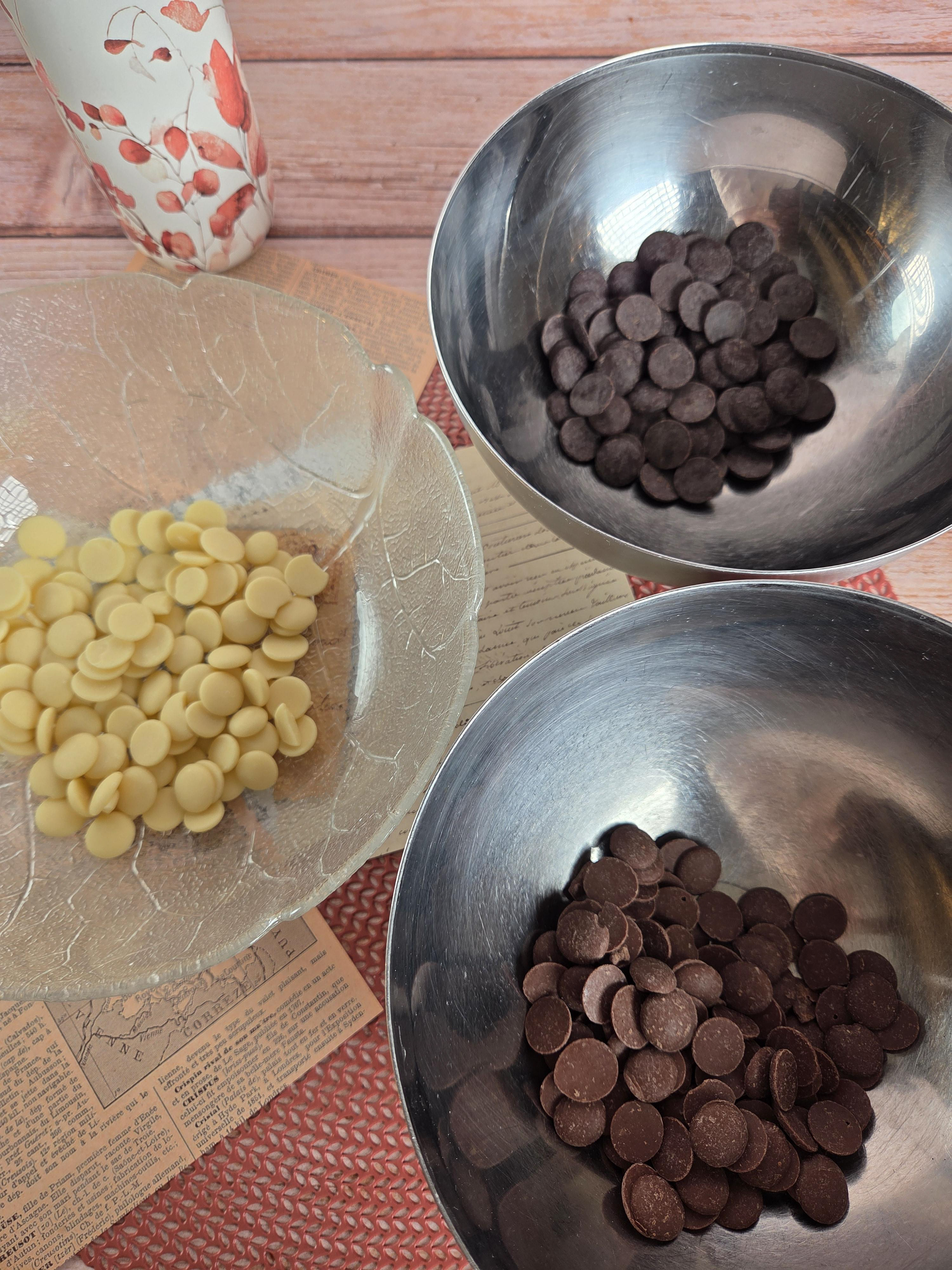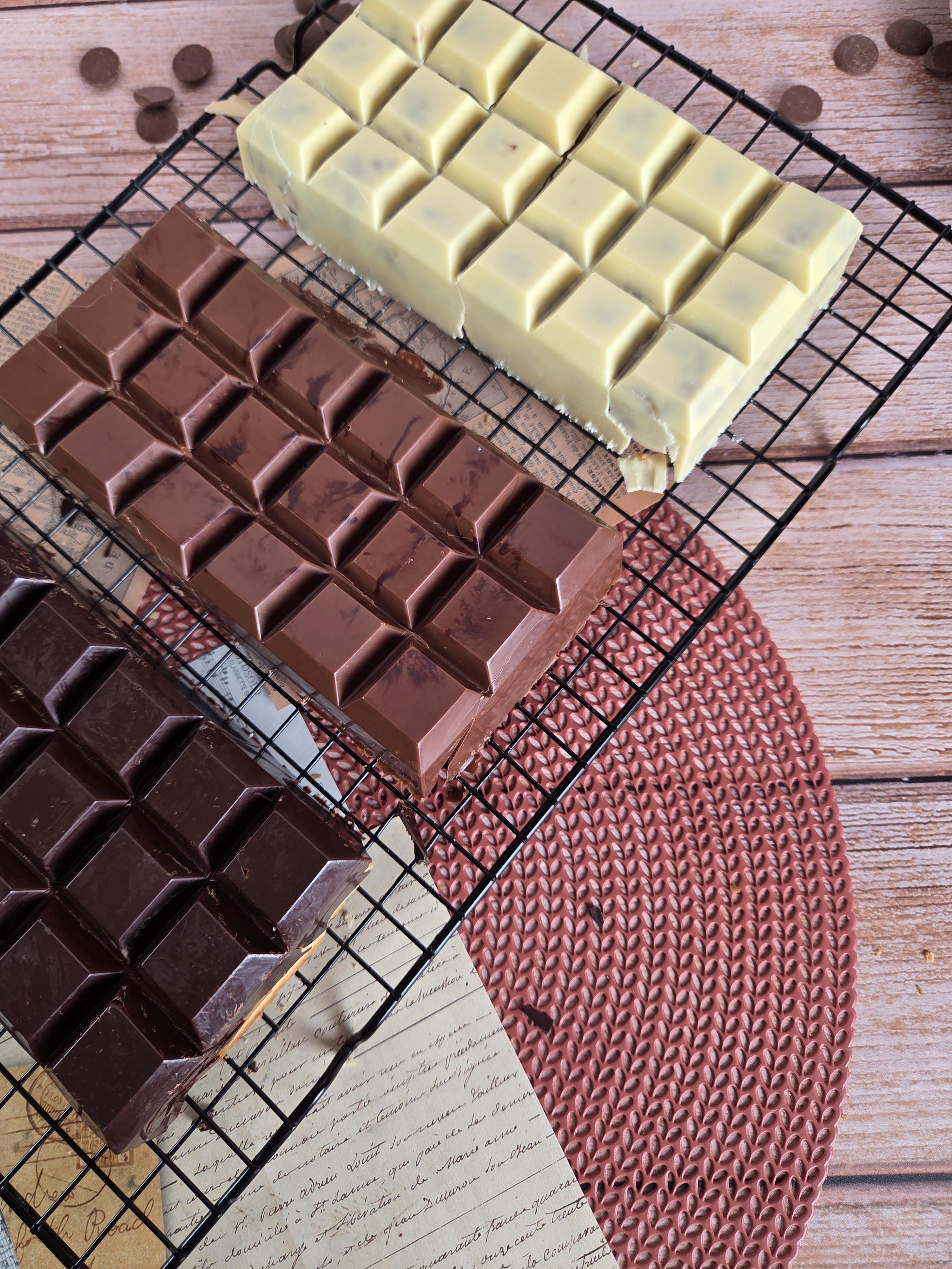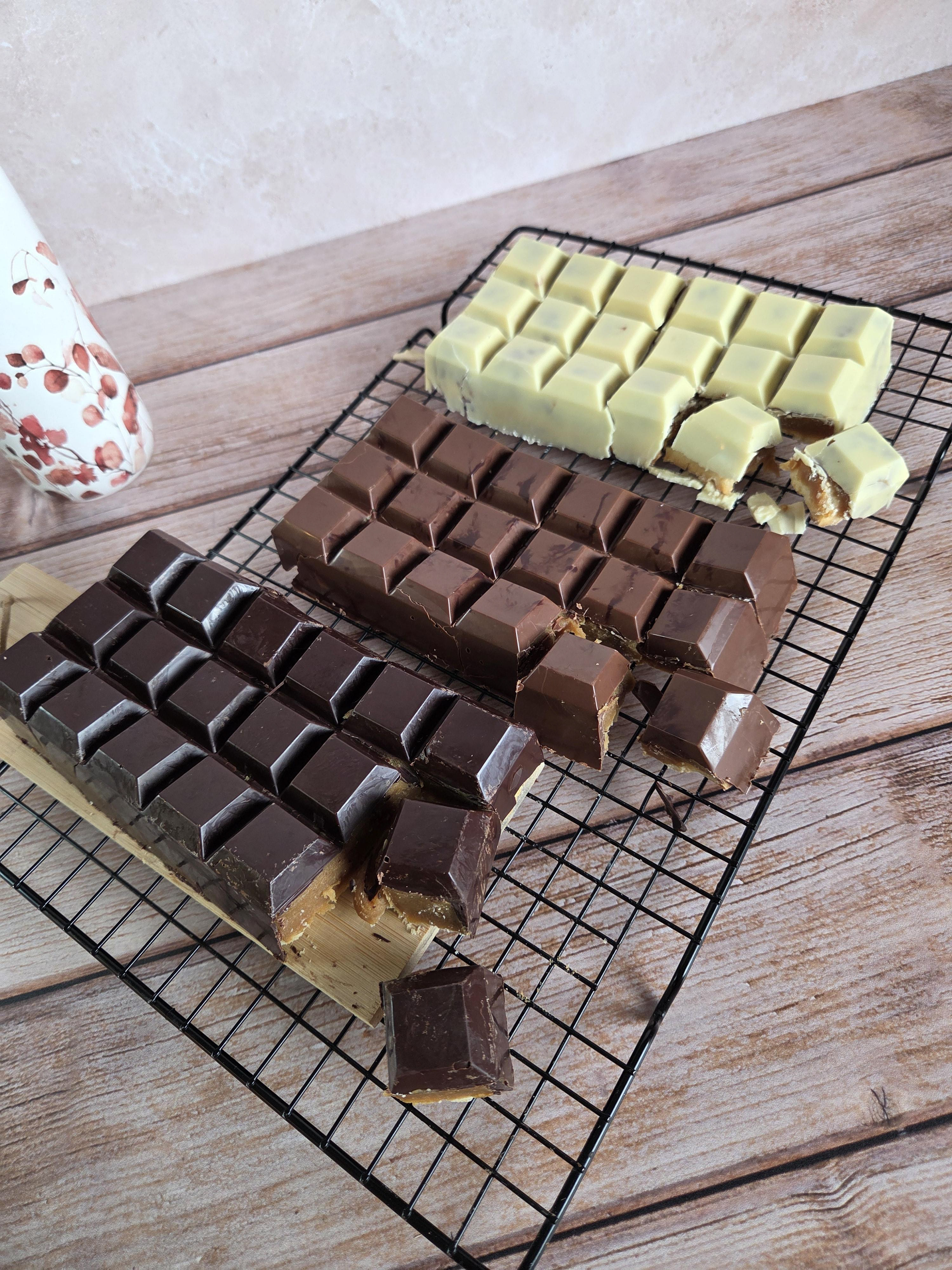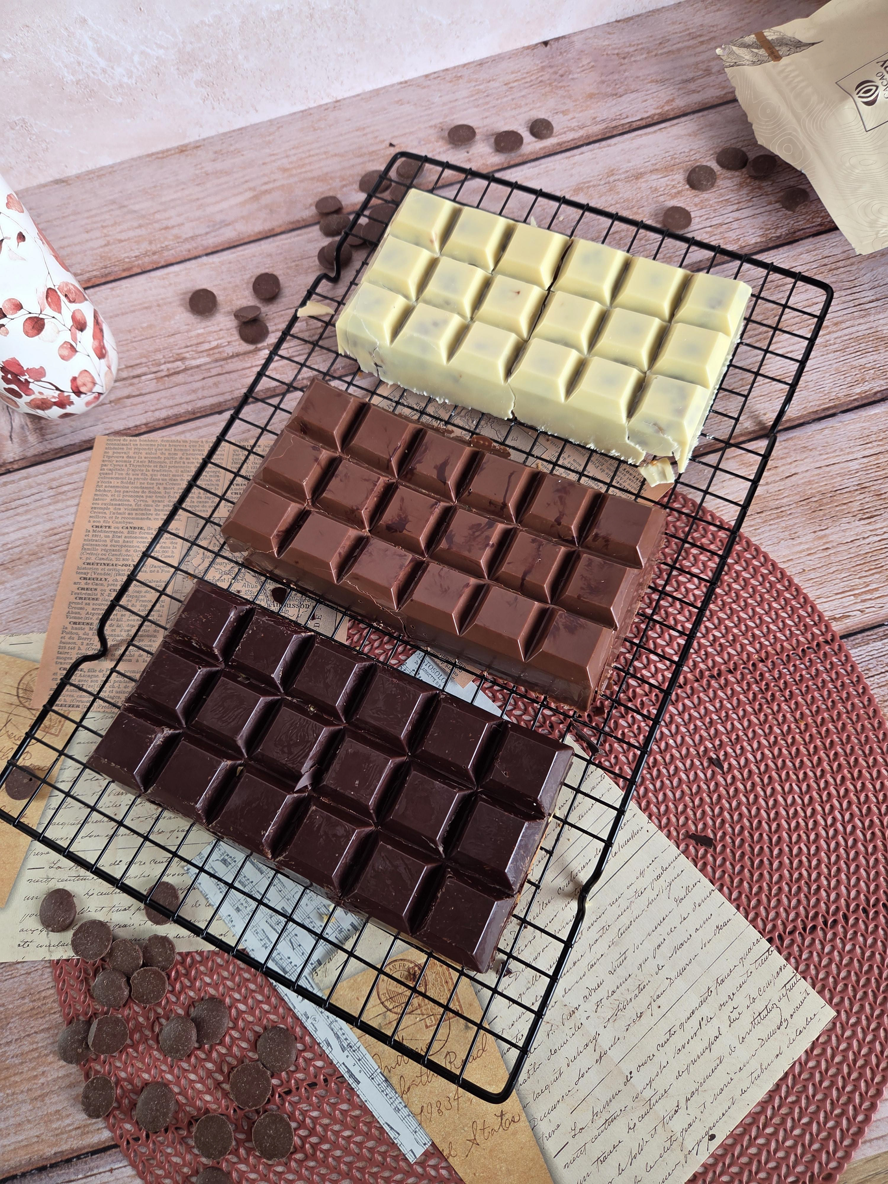 1 - Faire fondre 300 g de chocolat noir (ou 100g de chocolat noir, 100g de chocolat blanc et 100g de chocolat au lait si 3 tablettes de couleurs différentes) au bain-marie ou au micro-ondes.