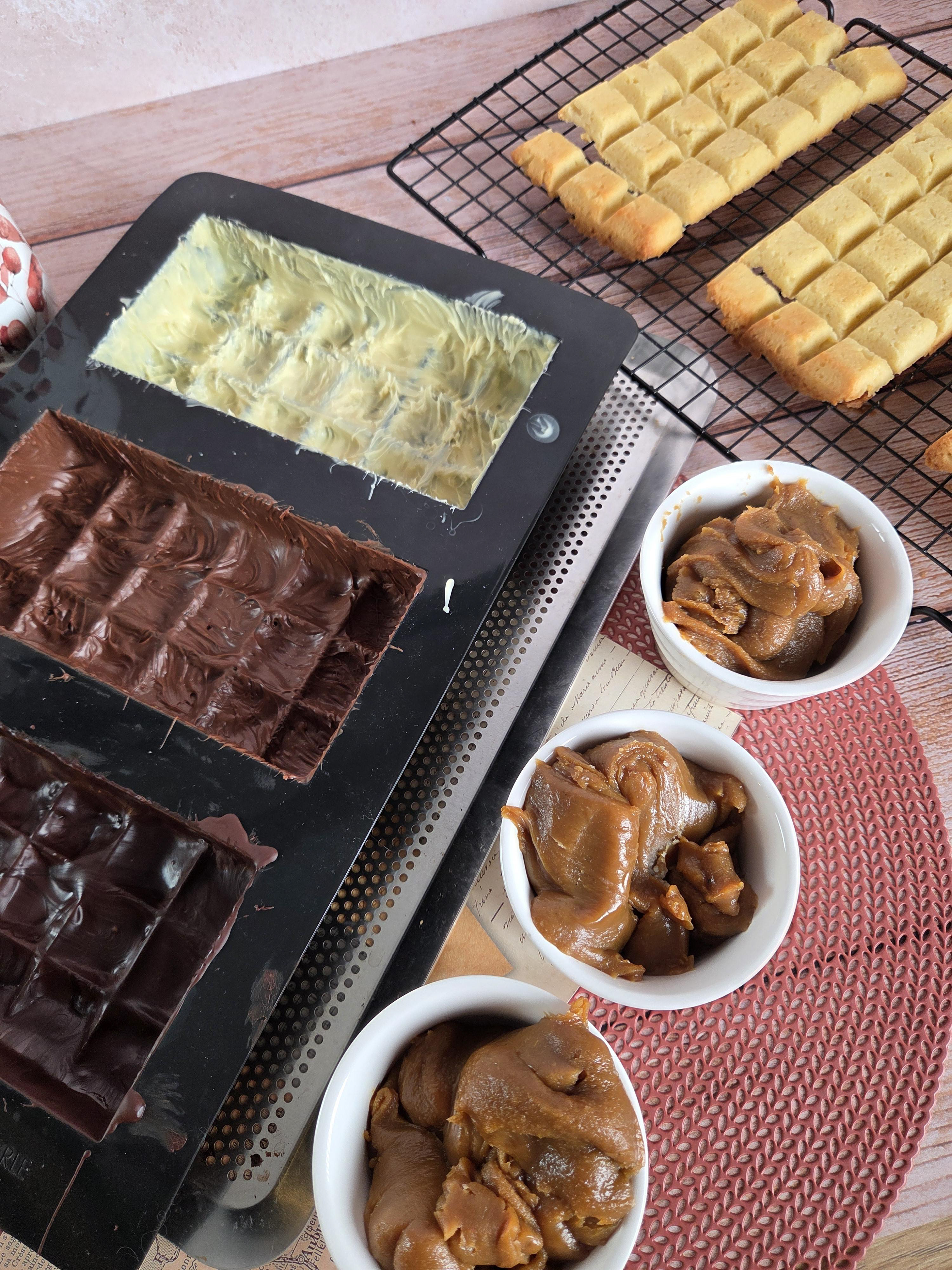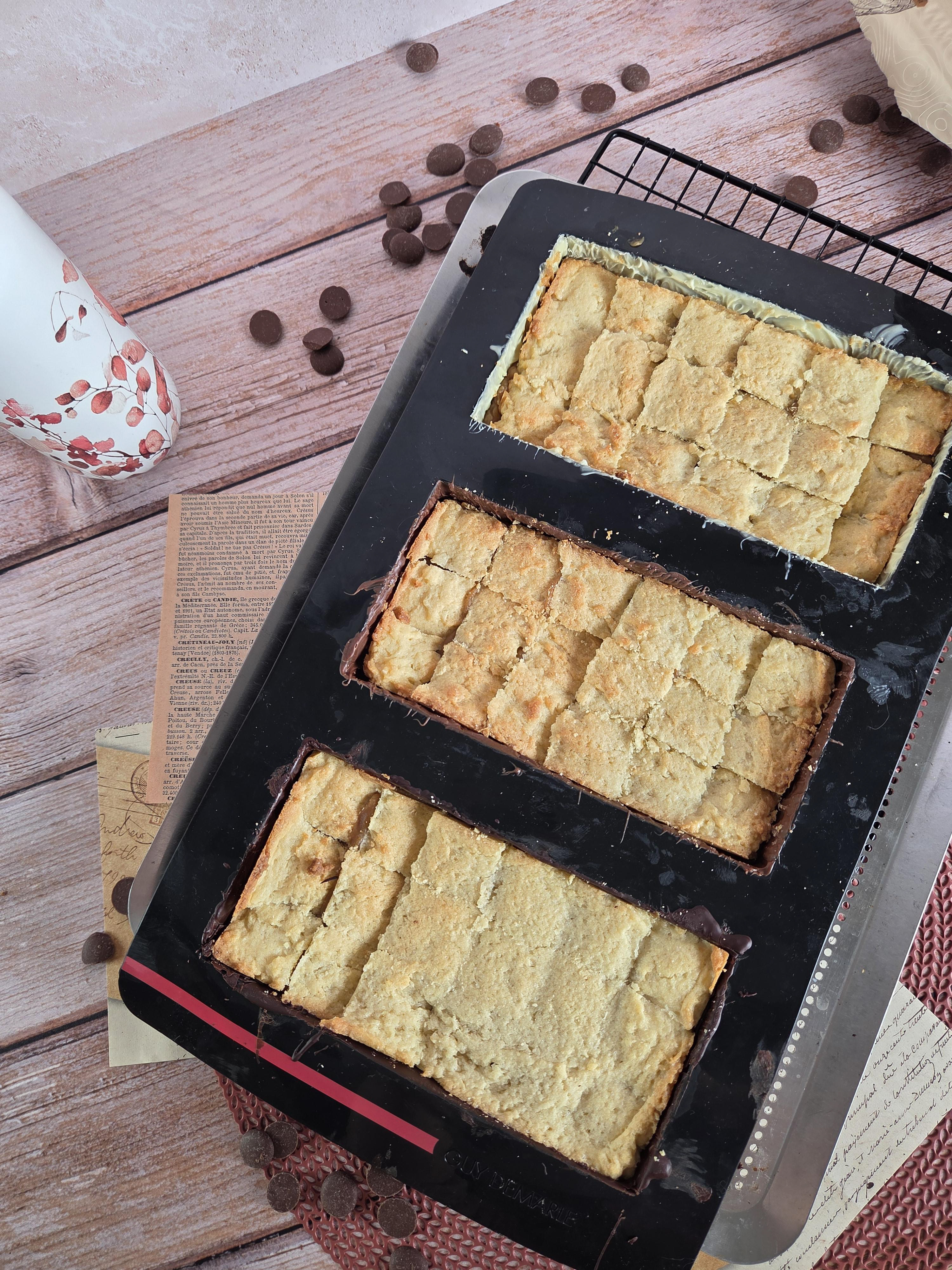 4 - Au bout de ces 30mn, répartir le caramel dans les 3 empreintes, placer le biscuits par dessus et remettre au réfrigérateur 1h minimum.
