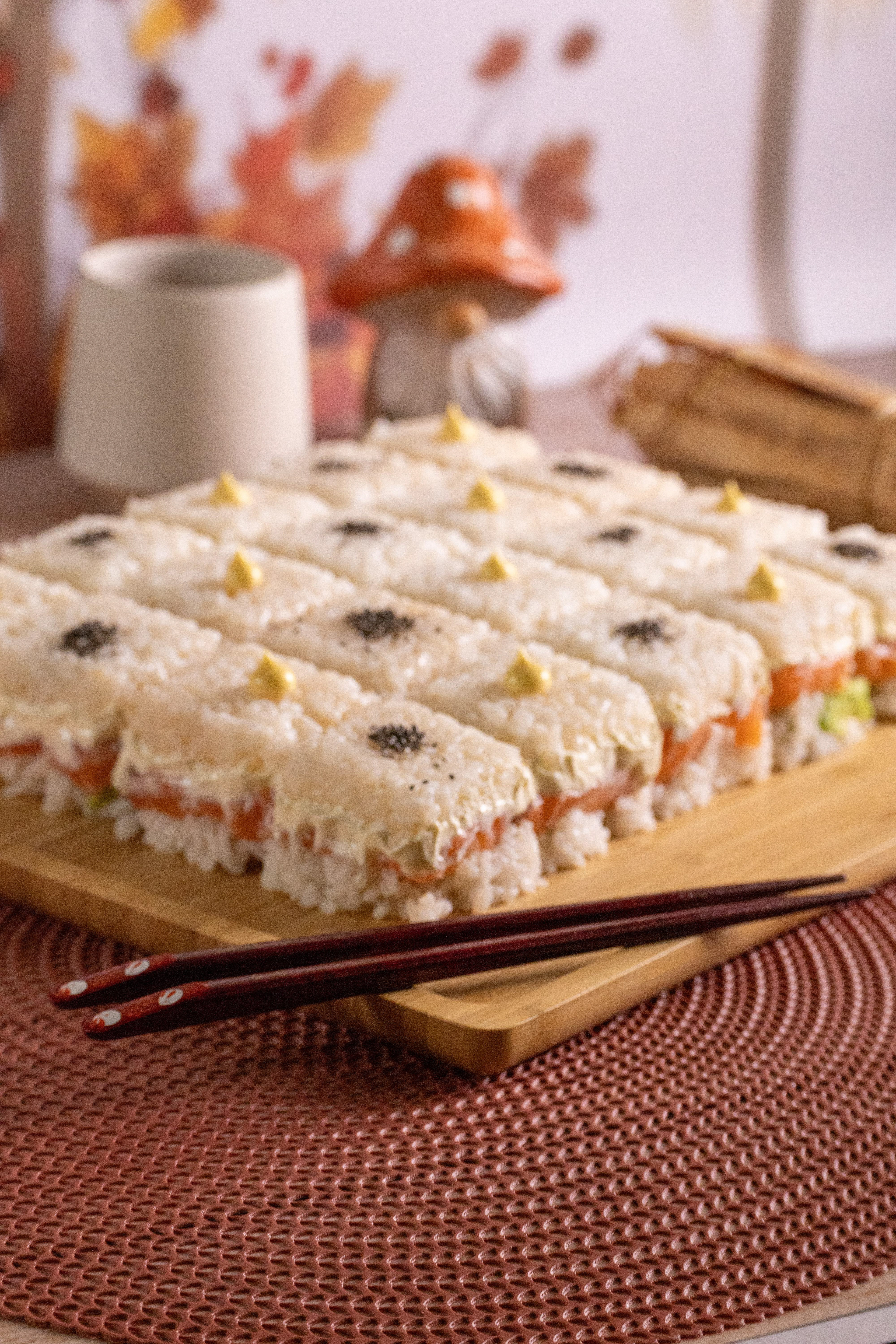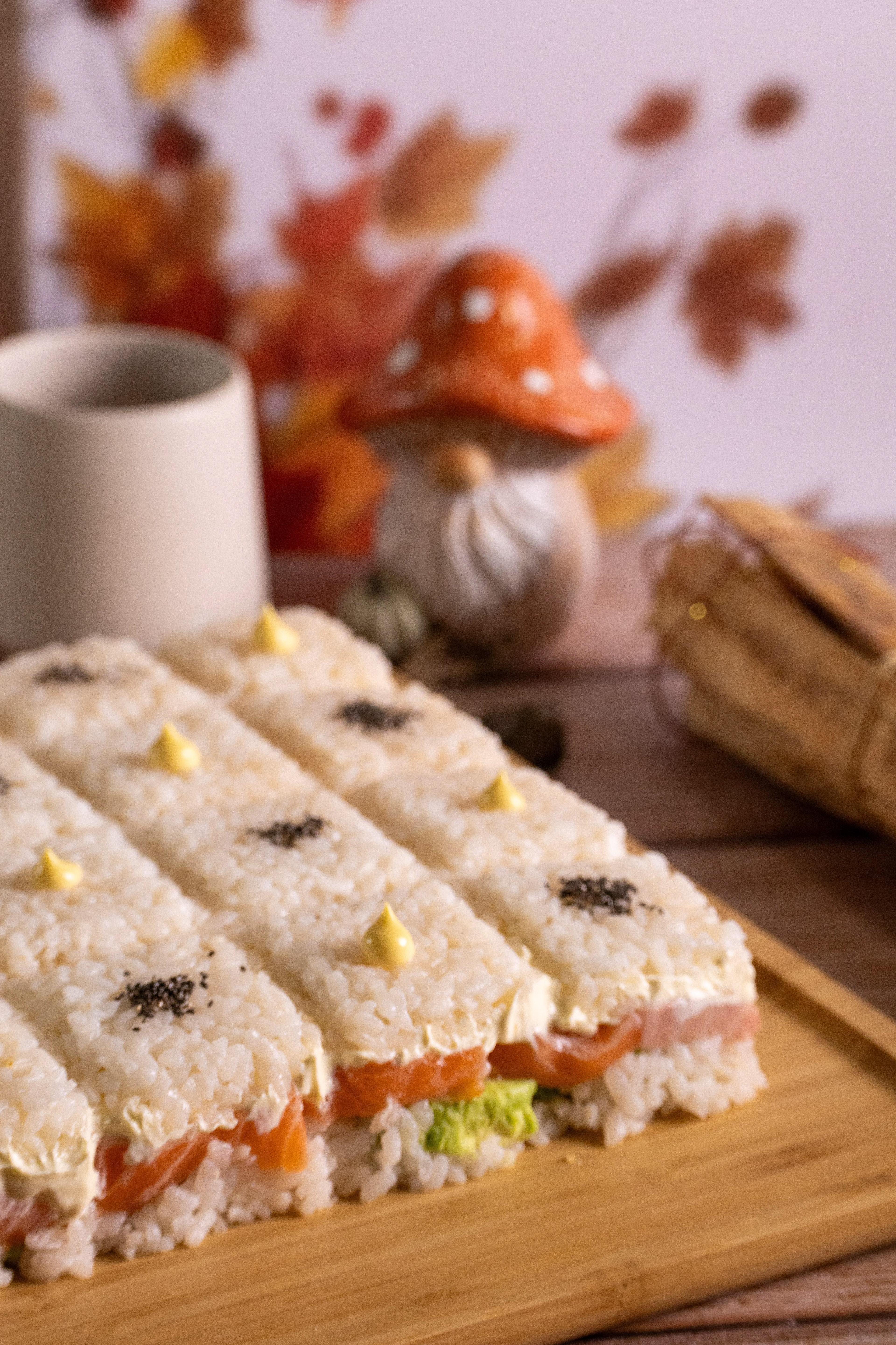 7 - Ajouter la moitié du riz et l’étaler avec les doigts trempés dans de l’eau froide.
