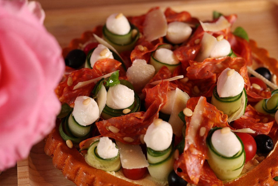 3 - A vous d’être créatif pour garnir le dessus de la tarte ! Charcuterie fine, tomates cerises, graines, olives, poivrons grillés, faites vous plaisir pour garnir votre tarte pour qu’elle soit à votre goût et au goût de vos convives !